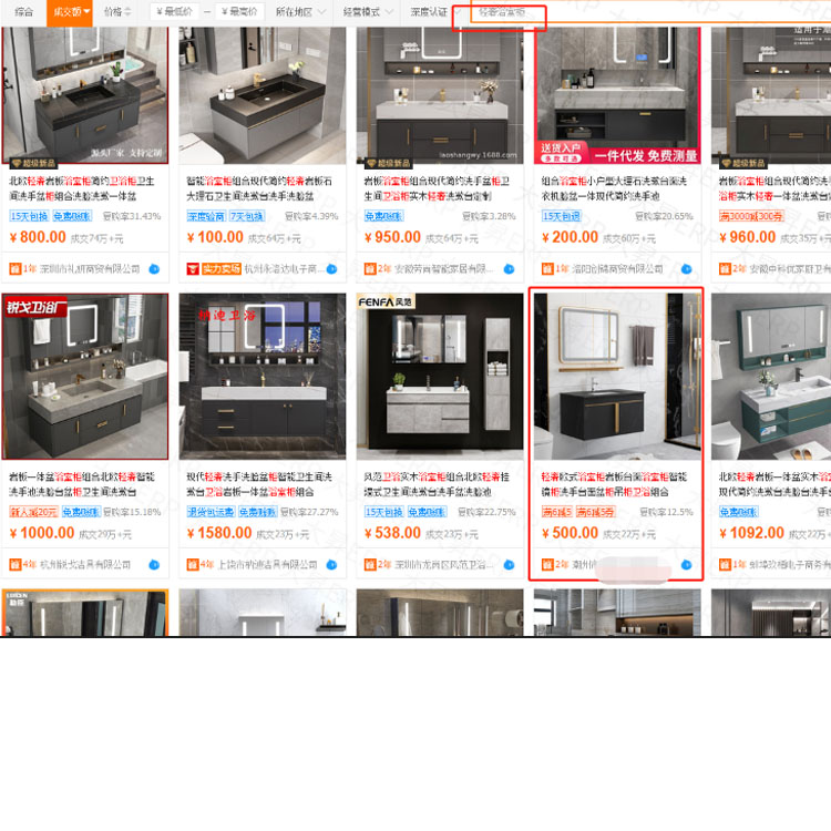潮州市浴室行业白总使用大昇ERP ,店铺核心关键词轻奢浴室柜,综合排名在阿里首页第一页,成交额在阿里首页排名第十名