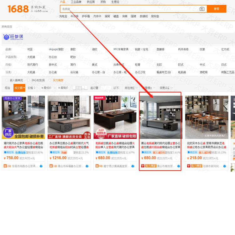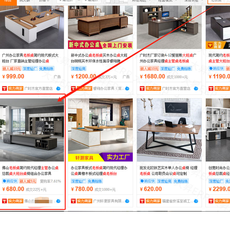 佛山市家具行业王总使用大昇ERP ,店铺核心关键词老板桌,综合排名在阿里首页第一...